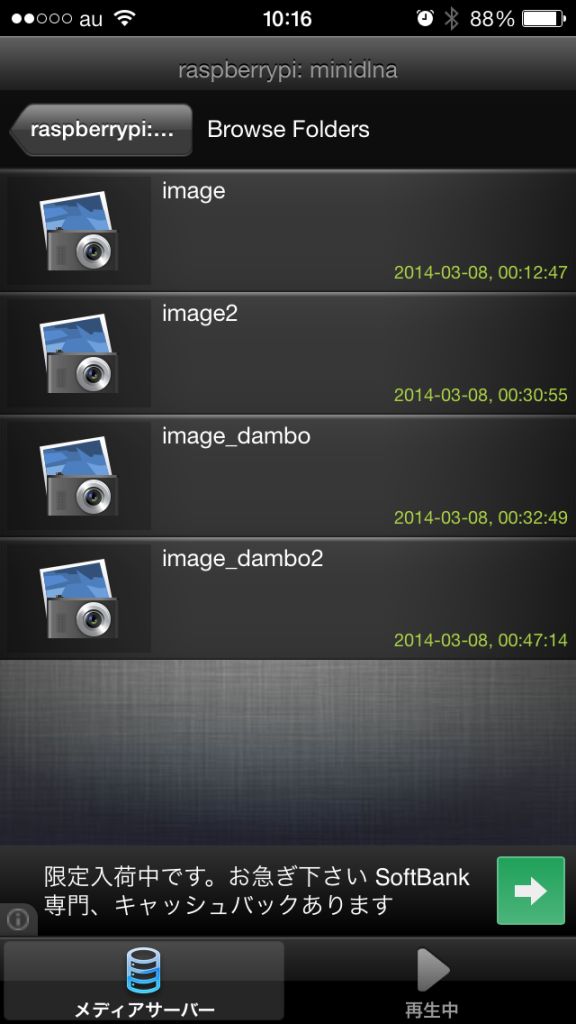 同じローカルネット内にiPhoneとRaspberry Piが接続されていれば、トップ画面の”Servers”で、”raspberrypi: minidlna”が出てくるハズです。ただ、検出されるまでに数分かかることがある模様です。あとは”Browse Folders”などを見て行くと、先ほど撮影した写真にアクセスできると思います。