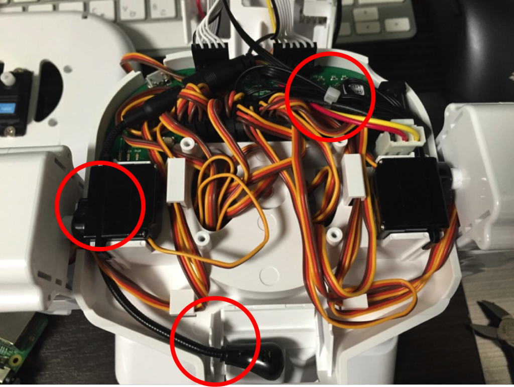 ラピロの胴体を開けて、マイクを入れてみます。露出する部分にマイクのアームを収めるために、ちょっと部品をカットして、ラピロの右脇下を通して後ろに流します。ここで先ほどの延長ケーブルに接続して、可能な限り、ここでケーブルを束ねてしまいます。あとは他の白黒ケーブルと同様、ケーブルを頭の中に引っ張ってきて、USBオーディオのマイク入力に接続します。