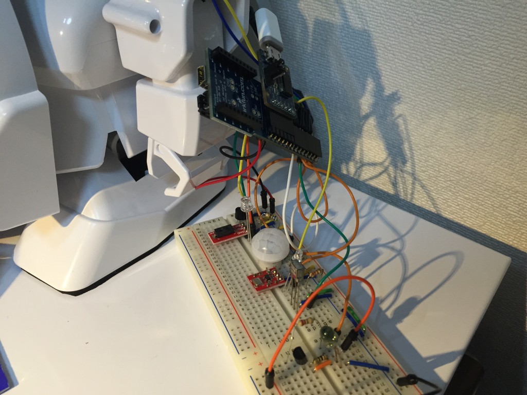 うーん、とりあえず動作確認するだけのためとはいえ、なかなかひどい感じです。右から順に、温度センサ、湿度センサ、照度センサ、人感センサ、マイク、LEDです。