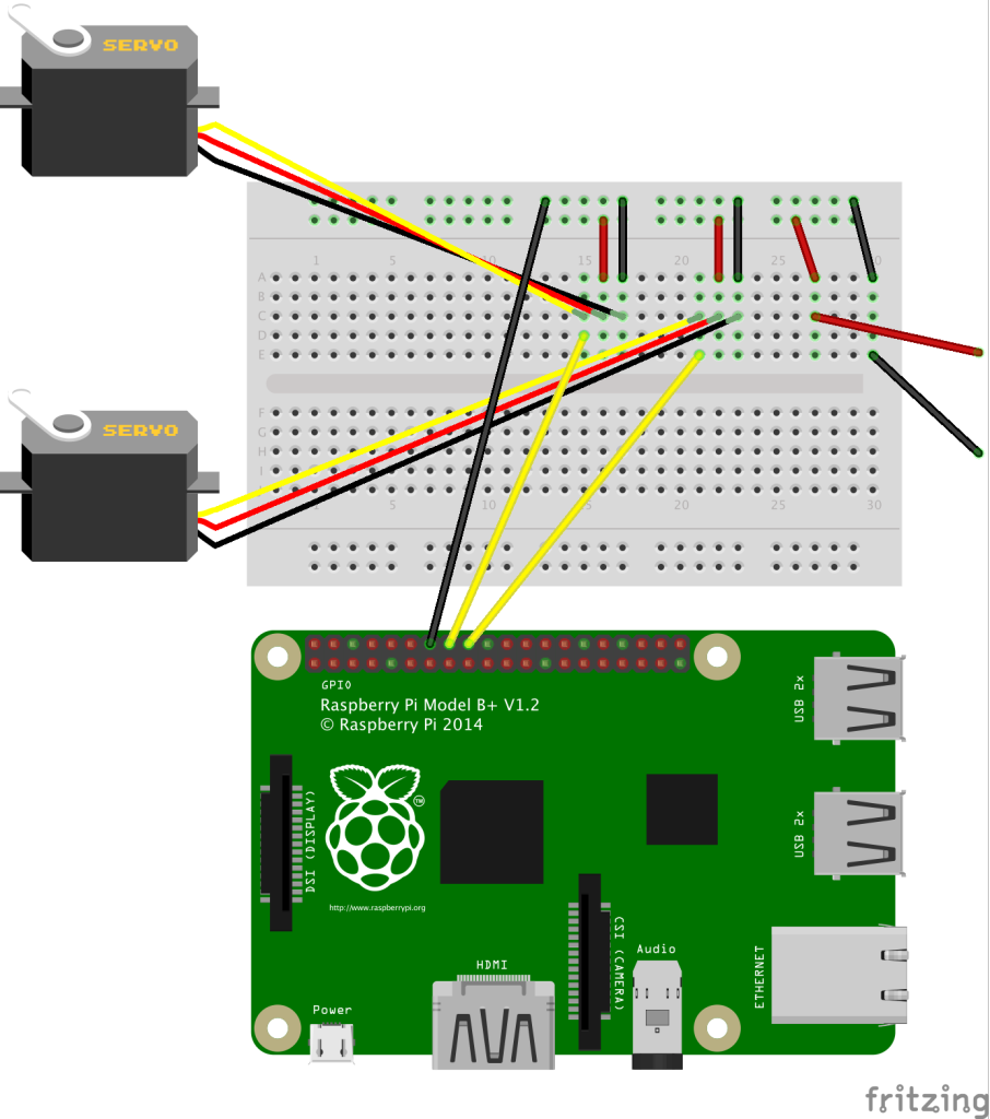 データシートを見ると、サーボの動作電圧は4.8V(〜5V)。モータ系は基本的に電流喰いなので、Raspberry Pi本体からの電力供給はやめといた方がよさそうです。配線はこんな感じかな。