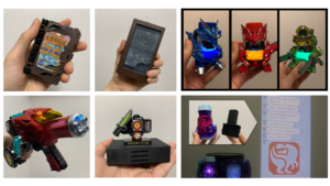 食玩HYPER DETAIL GEARのアークルが発表されたときから「ああ、これはいじりがいがあるなあ」と思っていて、とりあえず最低限4色に光らせることはできるかな、と思っていたのです。それで準備を進めていく中で、前に電子部品屋さんをうろついていたときに、携帯電話とかで使われている小型の振動モータが置いてあったのを思い出して、それを使えば羽根も回せかもと思い、それもやってみることにしました。そしてさらに、その直前に別件でジェスチャーセンサを使っていたこともあって、それを組み込めば限りなくコンセレに近づくかも、と思いつき、完成形のイメージが出来上がりました。