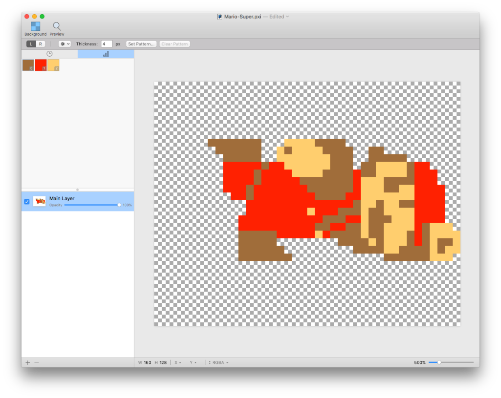 error while loading mario.bmpどうやら24bitのbmpでないとダメみたいなのですが、Pixenの出力するbmpは32bitなので、24bitに変換してやる必要があります。幸い、Pixenの出力したbmpファイルをMacのプレビューで開き直し、プレビュー上でbmp形式指定で書き出すことで、24bitに変換することができました。