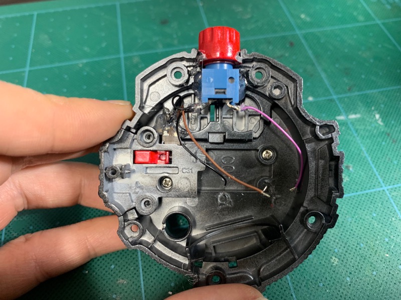 中央スイッチはこんな感じです。グルーガン(ホットボンド)でガチガチに固定しています。本体を閉じたときにスイッチが押しにくくなってしまう場合は、スイッチの口の縁の部分をデザインナイフなどで少し削ってスペースを開けてあげると、押しやすくなります。