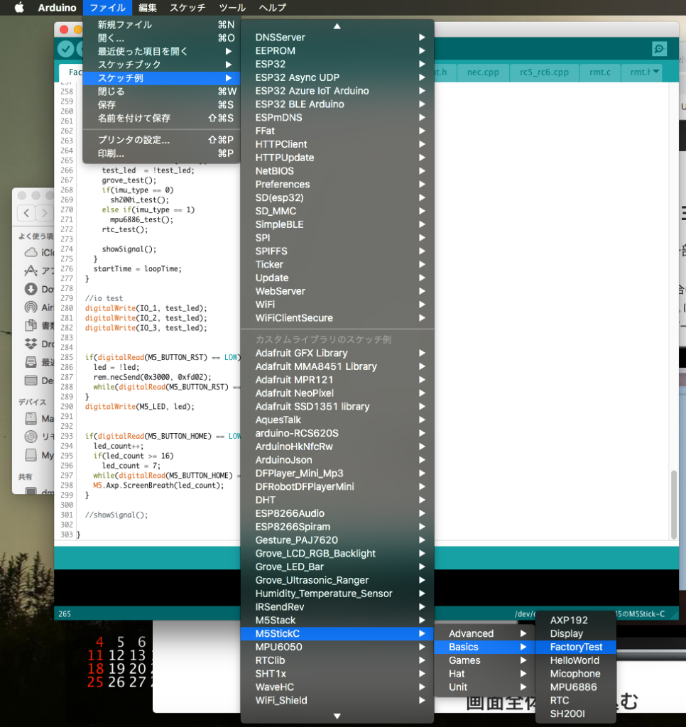 クイックスタートに従って、「ファイル」->「スケッチ例」->「M5StickC」->「Basics」->「FactoryTest」を開きます。