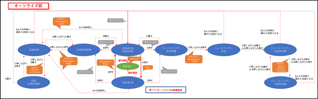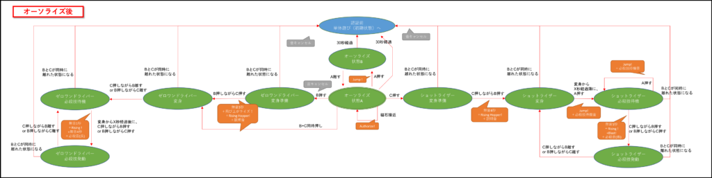 プログライズキーの状態は大きく「オーソライズ前」と「オーソライズ後」に分かれていて、それぞれの状態からスイッチの押し方によって、オーソライズ前だと武器用とフォースライザー用、オーソライズ後だとゼロワンドライバー用とショットライザー用に分岐していく形になります。