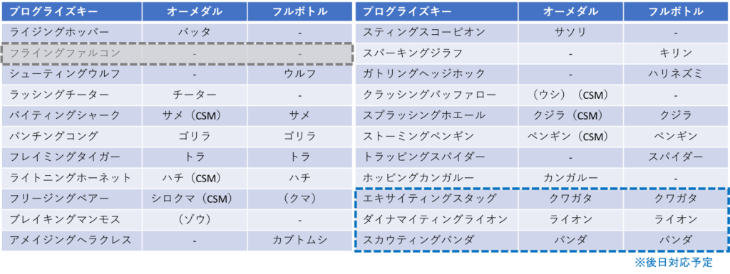 ただ、それだけだと対応できないプログライズキーがそこそこ存在しましたので(シューティングウルフ、スパーキングジラフ、ガトリングヘッジホッグなど)、それらをフォローするためにフルボトルにも対応させることにしました。