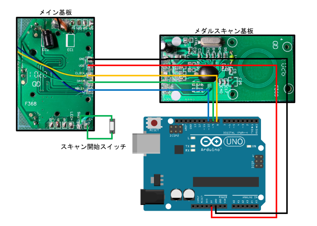 オースキャナーの基板は、メイン制御部と思われる基板と、メダル(RFID)スキャン用の基板の二つに分かれていて、ちゃんと解析すればスキャン用基板だけを使うこともできるのだと思いますが、今回はそこまで頑張る必要もないかなと思いましたので、スキャン用基板がメイン基板に送っている信号をArduinoにも流して、その信号をArduinoで解読することにしました。詳しくはソフトウェア解説の方で説明します。