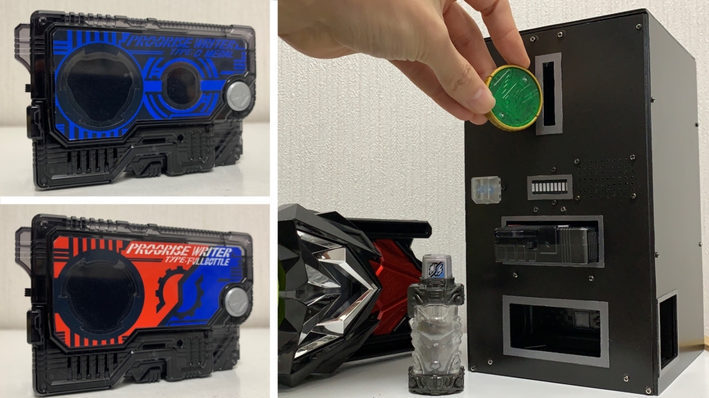 全体的なデザインは、オーメダルとフルボトルを使うというところが、何となくコインでジュースを買うのに対応するような感じがしたので、一般的な自販機っぽい雰囲気になるようにしたいと思いました。その上で、自分が小さい頃にギリギリオモチャ屋さんで見た記憶のある、ファミコンディスクシステムのディスクライター的な雰囲気も出したいなと思って、こんな形になりました。あんまり複雑なデザインはそもそも作れない、というのもありますけれど。
