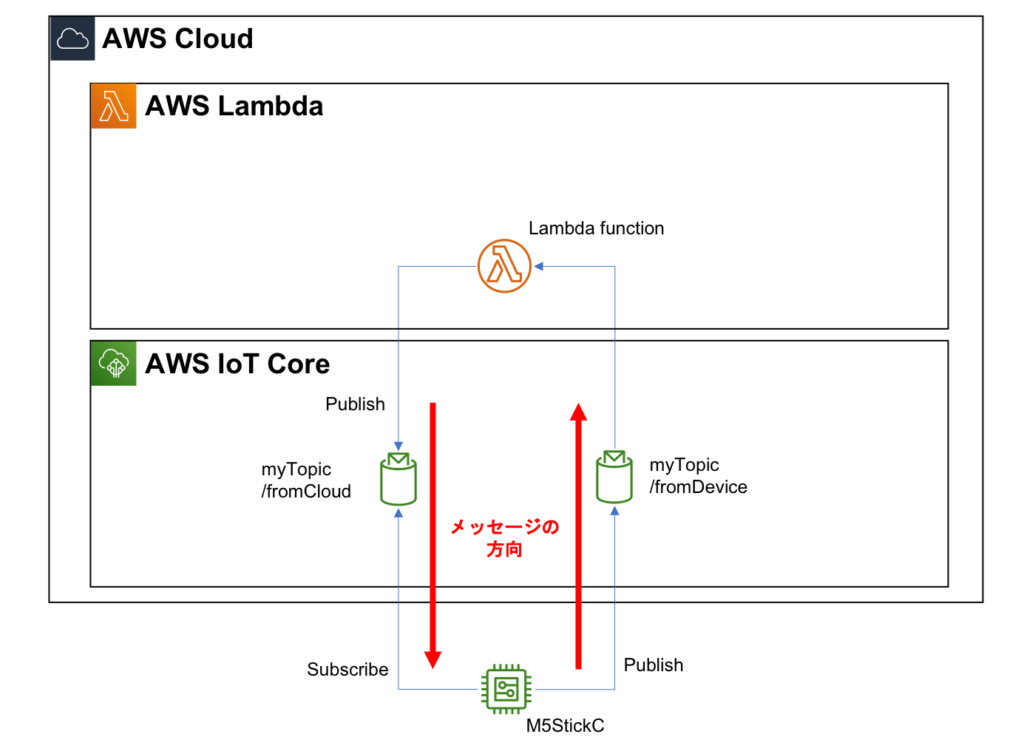こんな感じで、M5StickCからMQTTで送った情報をLambdaで処理し、その処理結果をM5StickCに返します。Lambdaの処理内容については今回は特に追求しないため、適当に値を2倍にして返す、ぐらいにしておこうと思います。