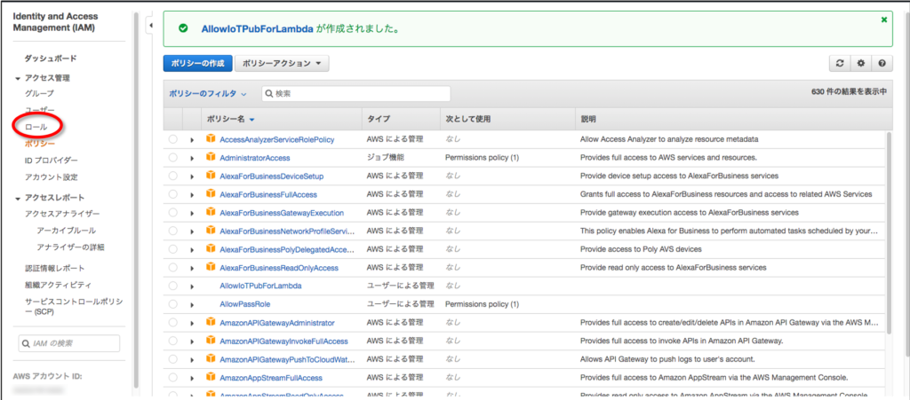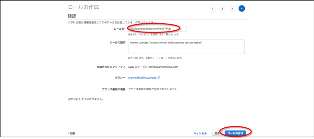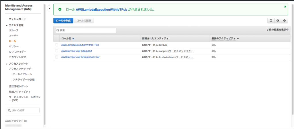 名前は適当に”AWSLambdaExecutionWithIoTPub”などとして、ロールの作成を完了させます。