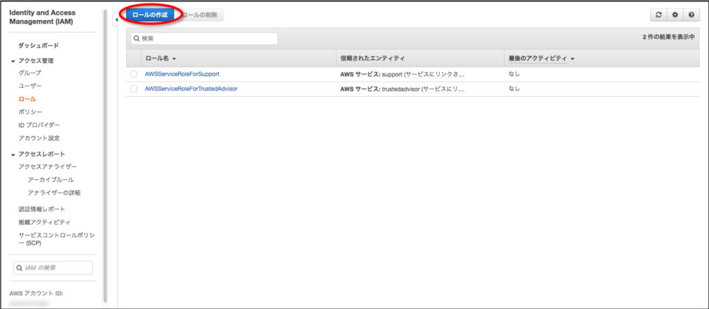 これで、少なくとも作業用ユーザは『(Lambda含む)任意のリソースに対してロールを付与する』という行為だけは許可されることになりました。ただ、あくまで許可したのはロールの『付与』だけで、ロールの『作成』を許可したわけではありません。作成まで許可してしまうと、結構強い権限になってしまう気がしますので。ということで、管理者ユーザのまま、今回使用するロールを作成していきます。ちなみに、「どうせ自分一人でやってることだし、いちいちロールを作るのに管理者ユーザに切り替えるのは面倒だ!」という方は、PassRoleだけではなくCreateRoleの権限まで作業用ユーザ(グループ)に付与すれば可能だとは思いますが、少なくとも私はやっていないので、正確なところはわかりません。