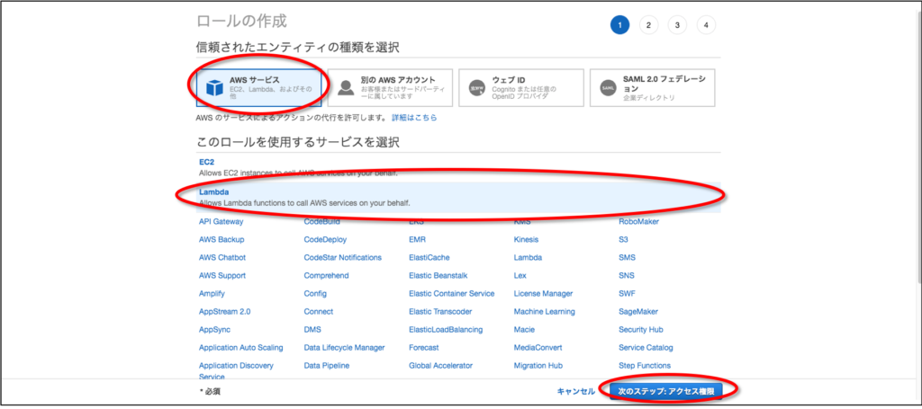 エンティティの種類を「AWSサービス」として、ロールを使用するサービスとしてLambdaを選択して次に進みます。