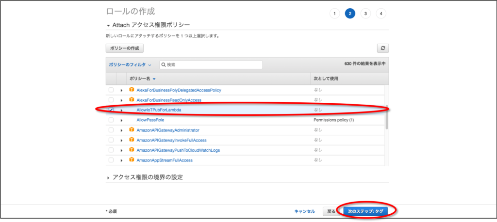 先で作成したポリシー(”AllowIoTPubForLambda”)を選択して次に進みます。