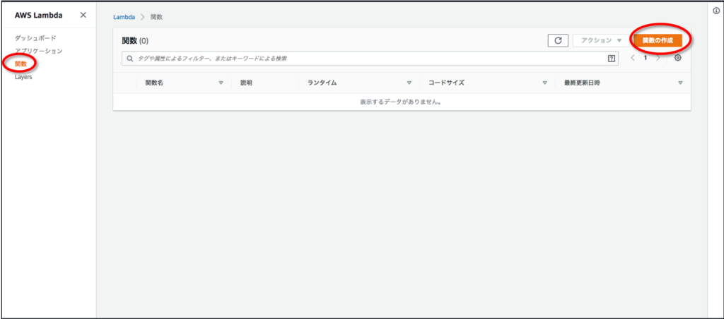 Lambdaの管理画面の「関数」から、「関数の作成」に進みます。