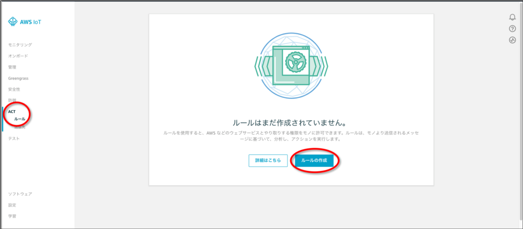 AWS IoT Coreの管理画面に入り、「ACT」の「ルールの作成」に進みます。