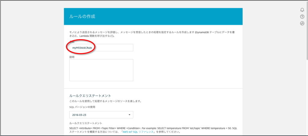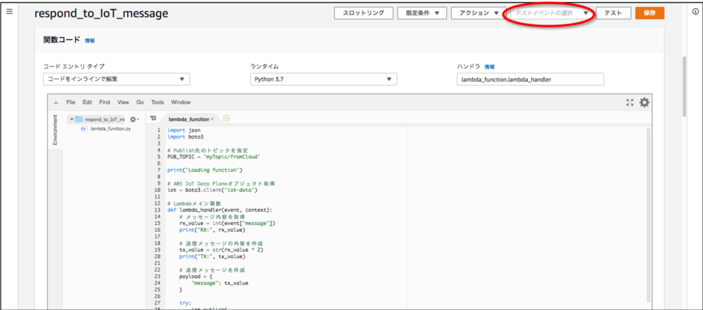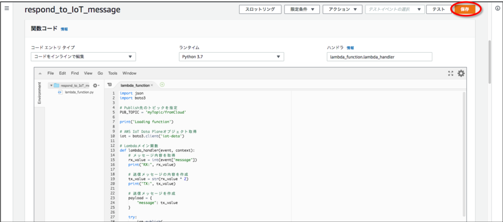 これでとりあえずLambda関数が作成されたので、次にこれをAWS IoTと連携するよう設定します。