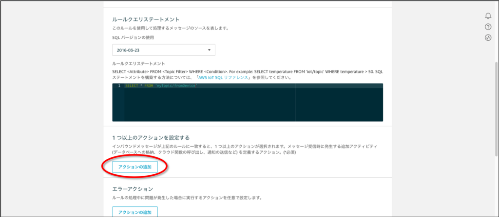関数名の選択画面になるので、先ほど作成した関数”respond_to_IoT_message”を選択して「アクションの追加」に進みます。