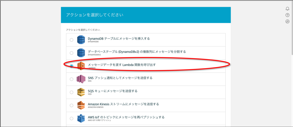 アクションの選択画面になるので、「メッセージデータを渡すLambda関数を呼び出す」を選択して「アクションの設定」に進みます。