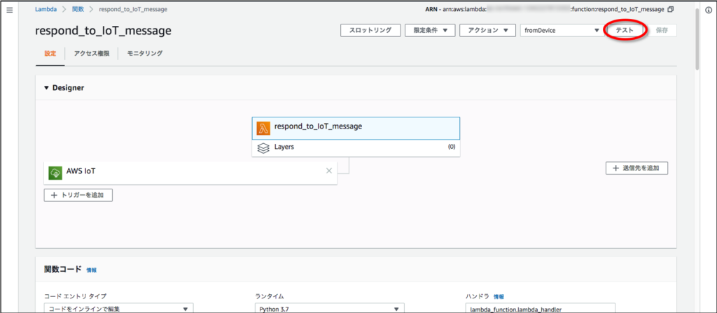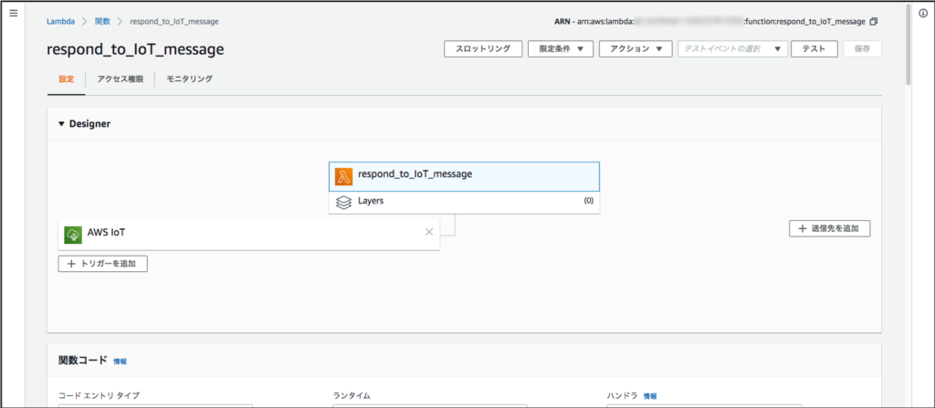ルールが正常に作成されたら、もう一度Lambdaの管理画面に戻り、関数”respond_to_IoT_message”の設定画面を開きます。