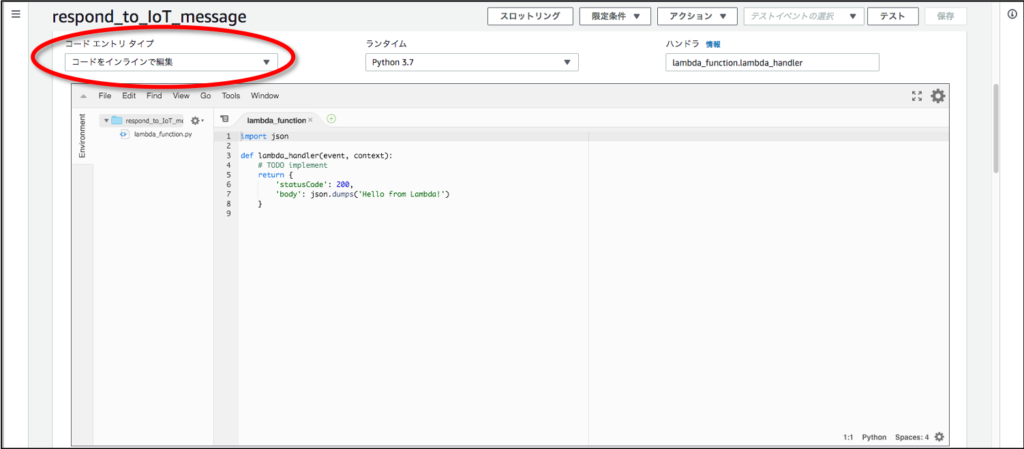 開発規模が大きくなってきたら、「コードエントリタイプ」で「.zipファイルをアップロード」とする形でソースを作成した方がよいのでしょうが、今回はイベントをキャッチしてメッセージをPublishするだけの短いコードですので、「コードをインラインで編集」で、そのままコンソール上でソースコードを編集してしまいます。