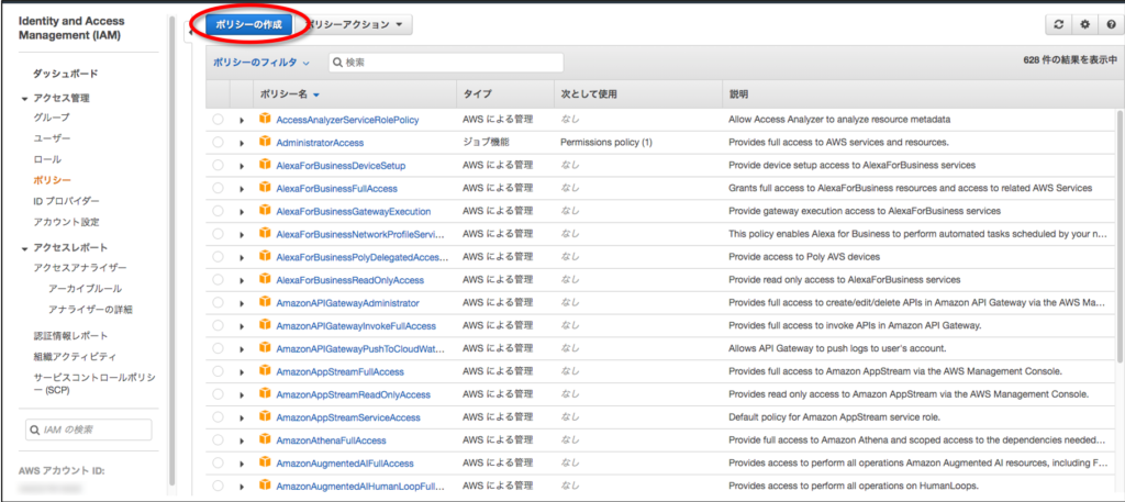 まず、管理者ユーザでIAMの管理画面から「ポリシー」の設定に入ります。