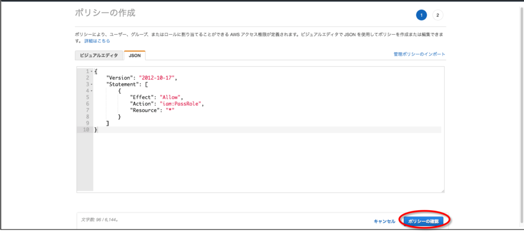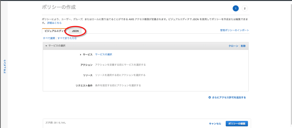 ビジュアルエディタで設定しても良いですが、今回はコピペで済むようにJSONで設定します。JSONの入力画面になったら、以下をコピペして「ポリシーの確認」に進みます。