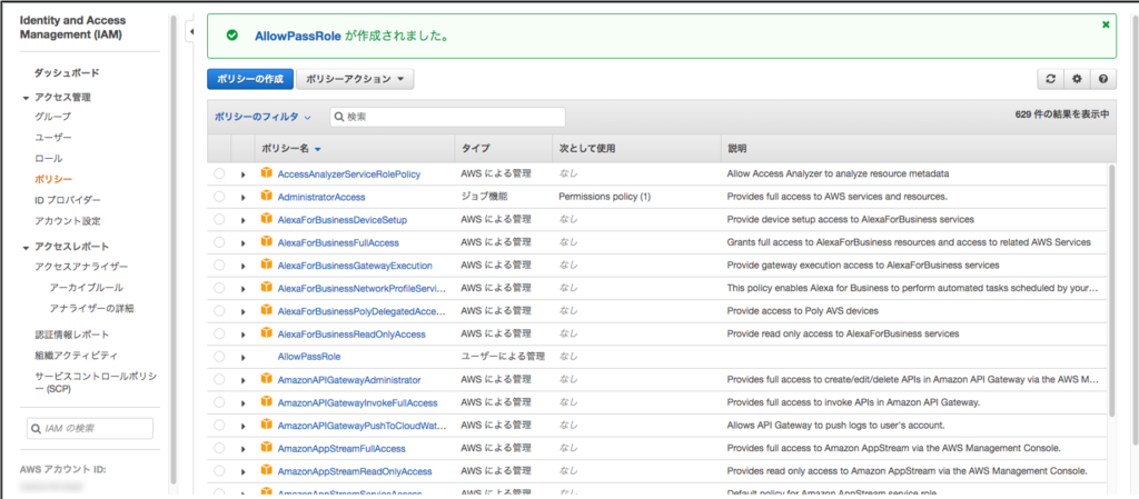 名前は適当に、例えば”AllowPassRole”などにして、ポリシーの作成を完了させます。