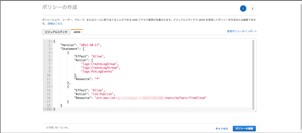 したがって、こちらをベースに、今回必要になる権限(=AWS IoTのMQTTトピックに対するPubishする権限)を追加します。先ほどと同様に新規のポリシー作成画面に入り、JSONで以下のように設定してください。