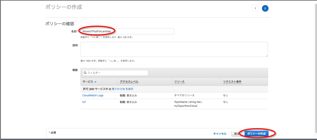 名前は適当に”AllowIoTPubForLambda”とかにして、ポリシーの作成を完了させます。ここで設定したポリシーを、ロールに対して紐付けます。
