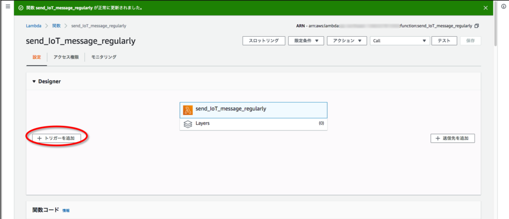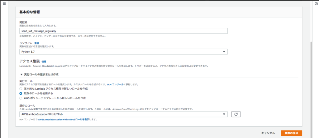 | アクセス権限 | 既存のロールを使用する: AWSLambdaExecutionWithIoTPub |