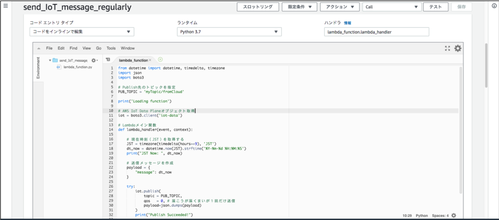 return "Failed."前回作成したものから、AWS IoTトピックからのメッセージ受信処理をなくして、代わりに現在時刻(JST)を取得してメッセージとして送信するよう書き換えています。