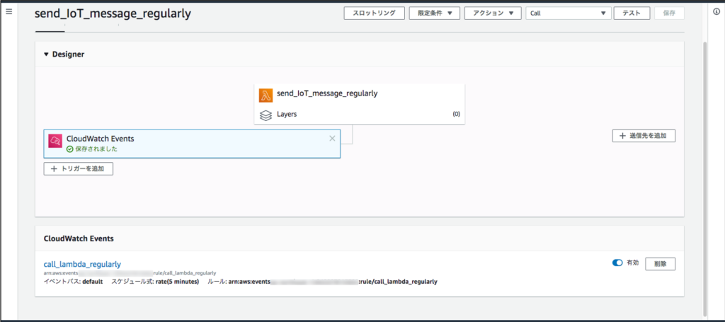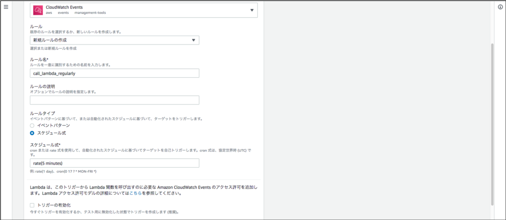 さて、ここからが本題です。Lambda関数のトリガーとしてCloudWatch Eventsを設定します。