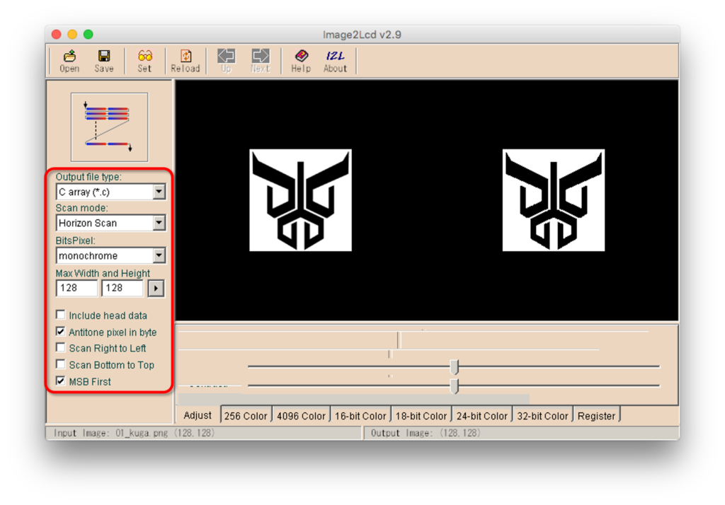一点ご了承頂きたいのは、実際にはこのファイルの他に、先のソフトウェア解説の方でも触れましたが、”riders_crest.h”というファイルが必要になります。こちらに全てのライダーズクレストのbitmap画像のデータ配列を記述しているのですが、これを全文掲載してしまうと、それだけでおよそ2600行になってしまいます。これは流石にブログに書くには大き過ぎるので、省略させて頂きました。作成の仕方(ヒント)は上記解説内で述べておりますので、データ配列を記載したファイルをご自身で用意頂けますと幸いです。