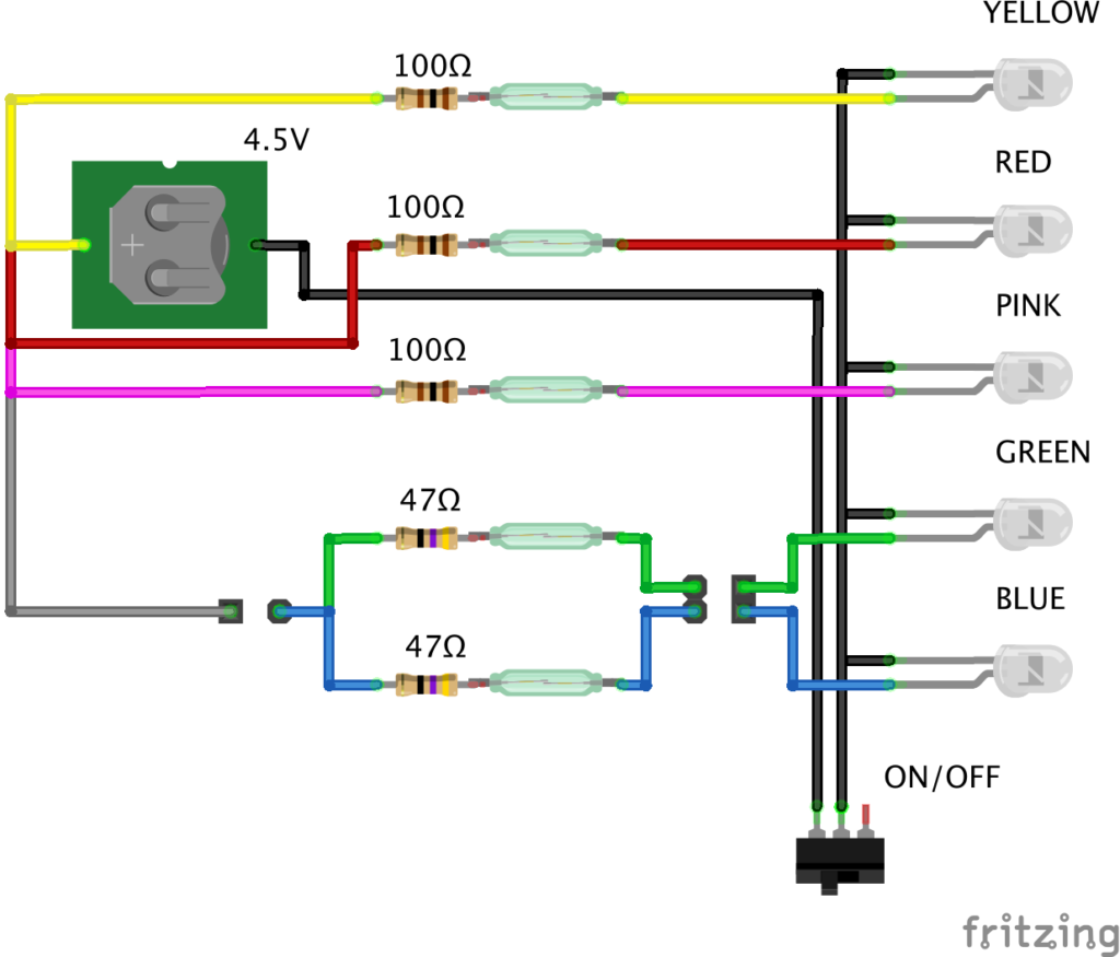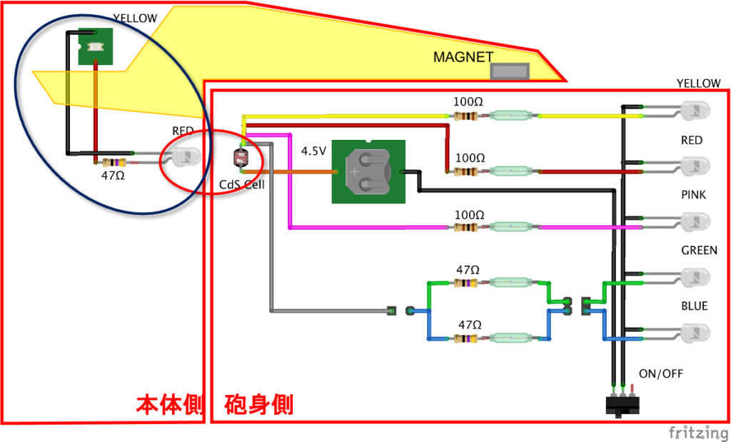 さて、これで「砲身が回転すれば銃口が発光する」という仕組みができました。回路図で表すとこんな感じになります。