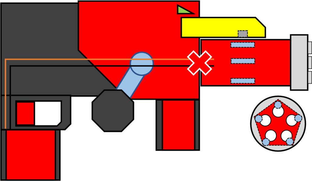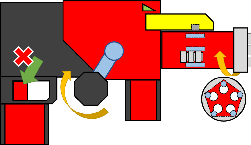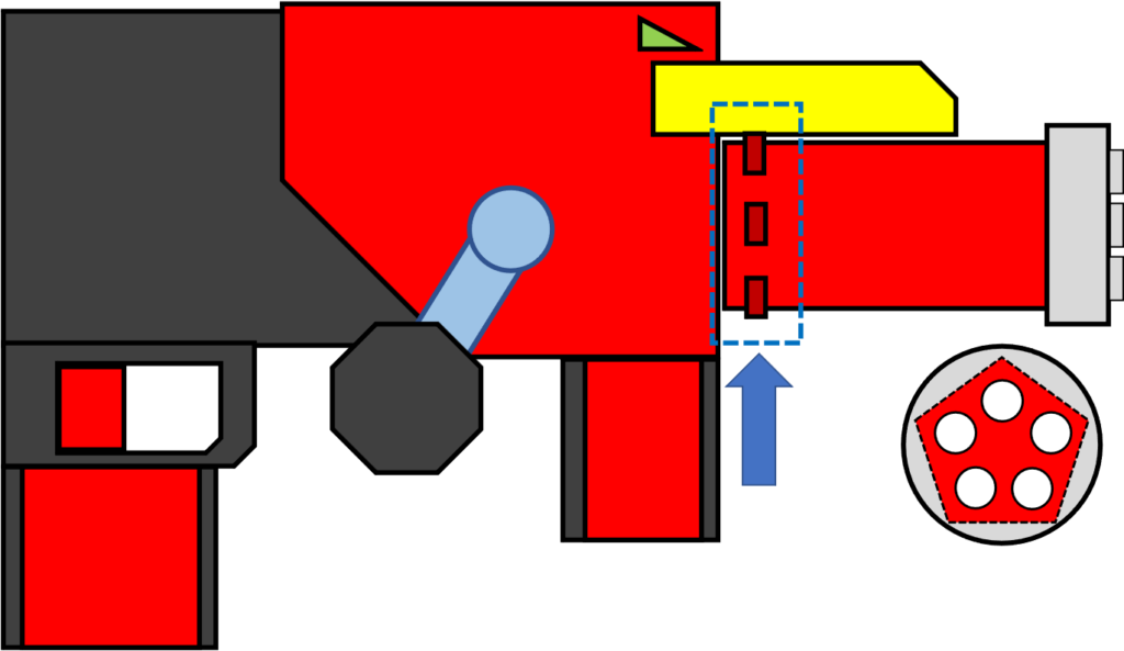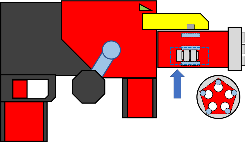 まず一つ目です。今回は銃口全てを常時光らせるのではなく、本物のガトリング砲のように、一度に一つの銃口を光らせるようにしたいと思いました。そうなると、スイッチを5つつけて、砲身の回転に合わせて1箇所だけONになるようにする、と考えるとわかりやすそうです。
