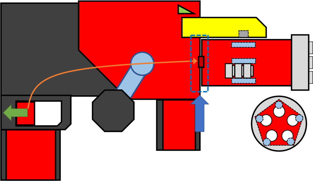 さて、このままでは、本体のハンドルを回せば発光しますが、本体のトリガー操作とは連動しません。本体トリガーと連動させるときに問題になるのは、「どうやって本体側のトリガー操作の信号を砲身側に伝えるか」です。