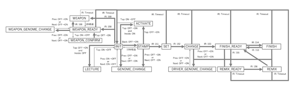 赤外線通信が実装できたら、次はそれを踏まえての状態管理です。実際のバイスタンプの動作はさておき、今作では以下のように状態を管理することにしました。