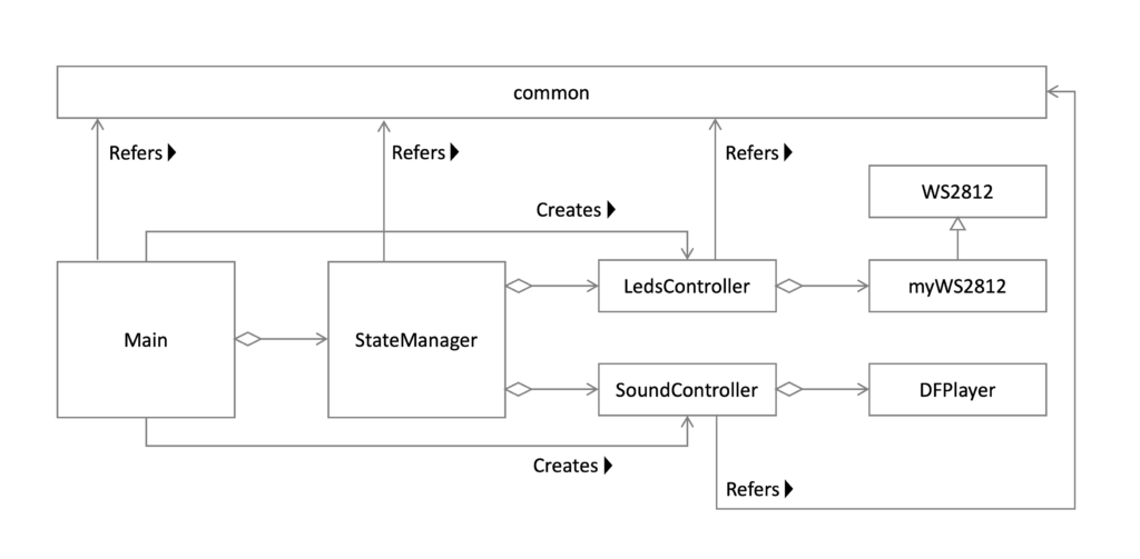 以上を踏まえて最終的に実装したソースコードは、本記事の最後に掲載しています。Arduino言語のときはほぼほぼ一つのファイルで作成してしまうことが多かったのですが、せっかくPythonに切り替えたので、もう少しファイルを分けて、オブジェクト指向言語っぽく書くようにしてみました。正しいクラス図の描き方は知りませんが、設計のイメージはこんな感じです。