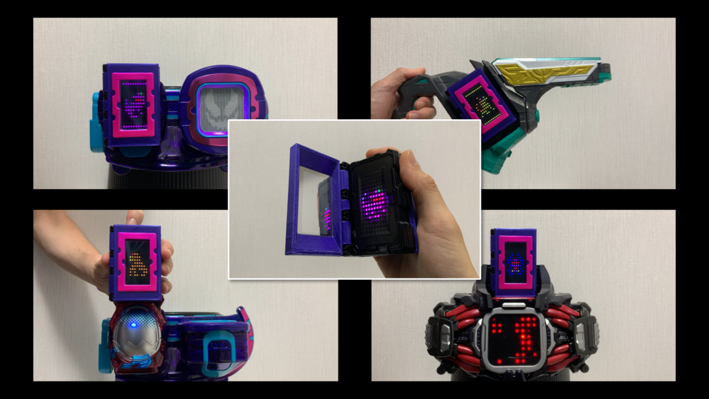 本状のアイテムということで、ワンダーライドブックのように、ベルトの操作で表紙が開くようなギミックも検討はしました。ただその場合、レバー操作時に物理的にスイッチを押せるリバイスドライバーは良くても、赤外線通信しか利用できないオーインバスター、ツーサイドライバー、デモンズドライバーなどでの使用も想定すると、ページを開くギミックを搭載しようとするとかなり大掛かりなものになり実装困難になることが予想されたため(←ソレノイドとかの実装が必要)、今のようなマジックミラーで表紙から中が透けて見える形の実装にすることにしました。
