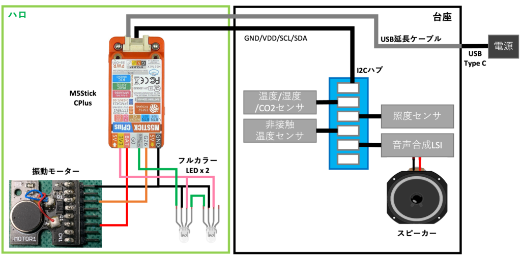 あとは個人的なこだわりで、ハロ本体のM5StickC Plusへの電源供給はACアダプタから直結じゃなくて台座経由で行えるようにしたかったので、短いUSB-Type C用の延長ケーブルも使用しました。