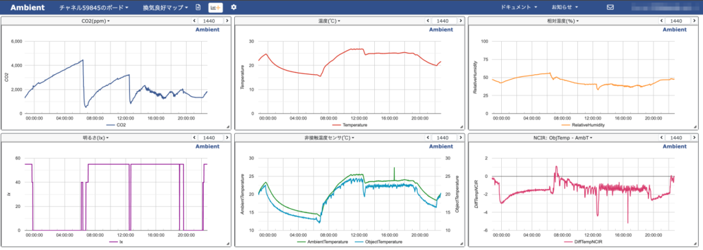 データの可視化には、データ可視化サービスであるAmbientを使用しています。データを定期的にクラウドにアップロードする処理だけ書いておけばグラフを自動的に作成してくれるので大変便利です。センサデータのアップロード周期が1分に1回程度で、かつ、データの長期保存も不要ということであれば、個人の無料プランの範疇で利用可能なので大変ありがたいです。Arduino向けライブラリも提供してくれているので利用も非常に簡単。このあたりの公式記事を参照頂くと良いと思います。