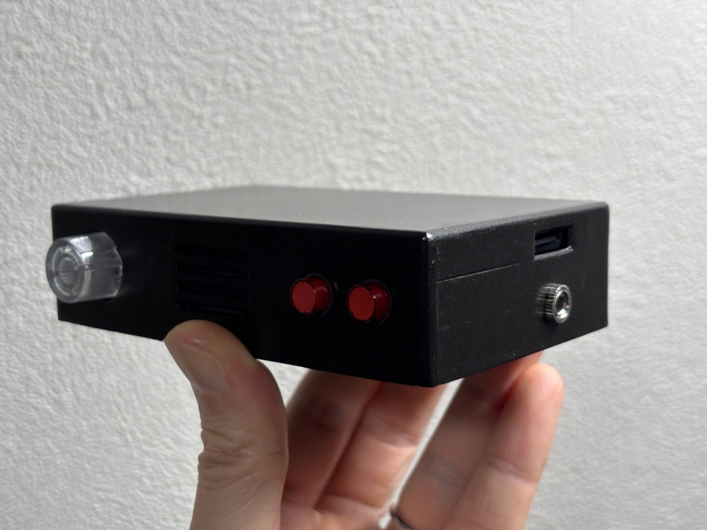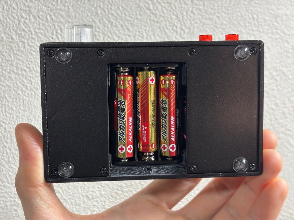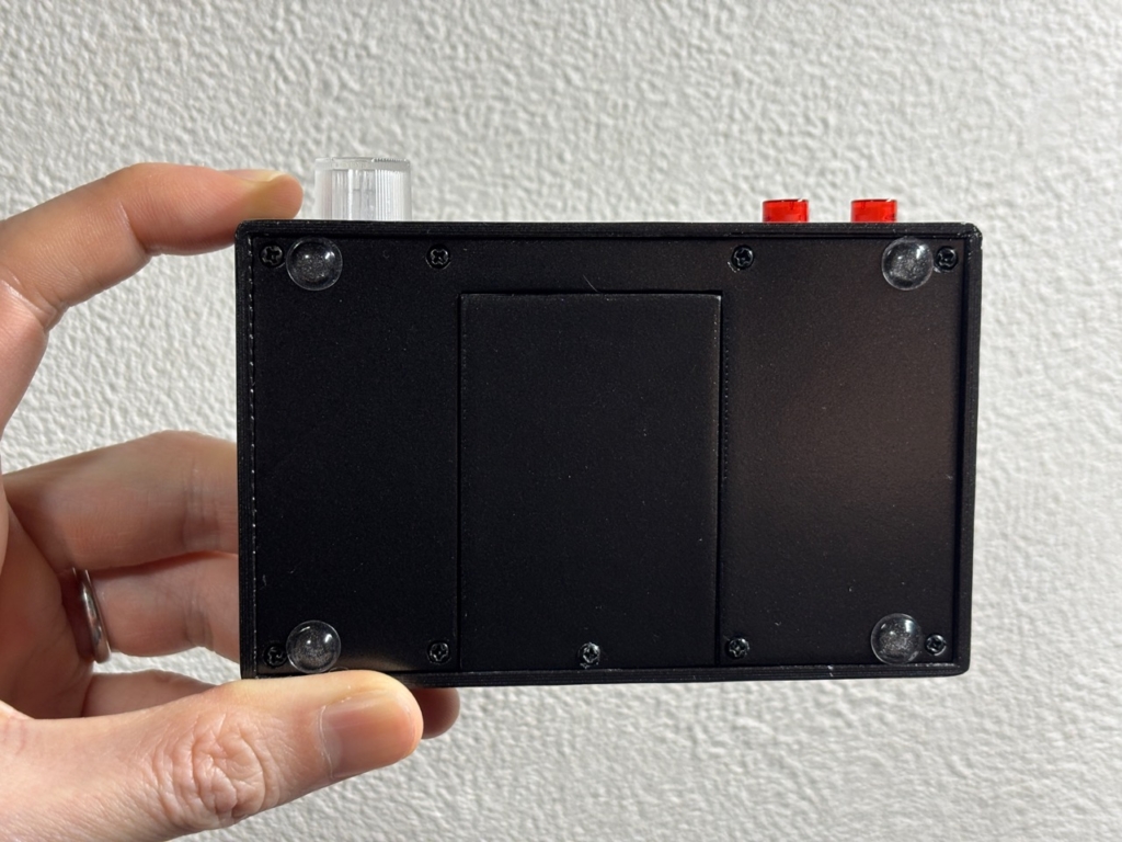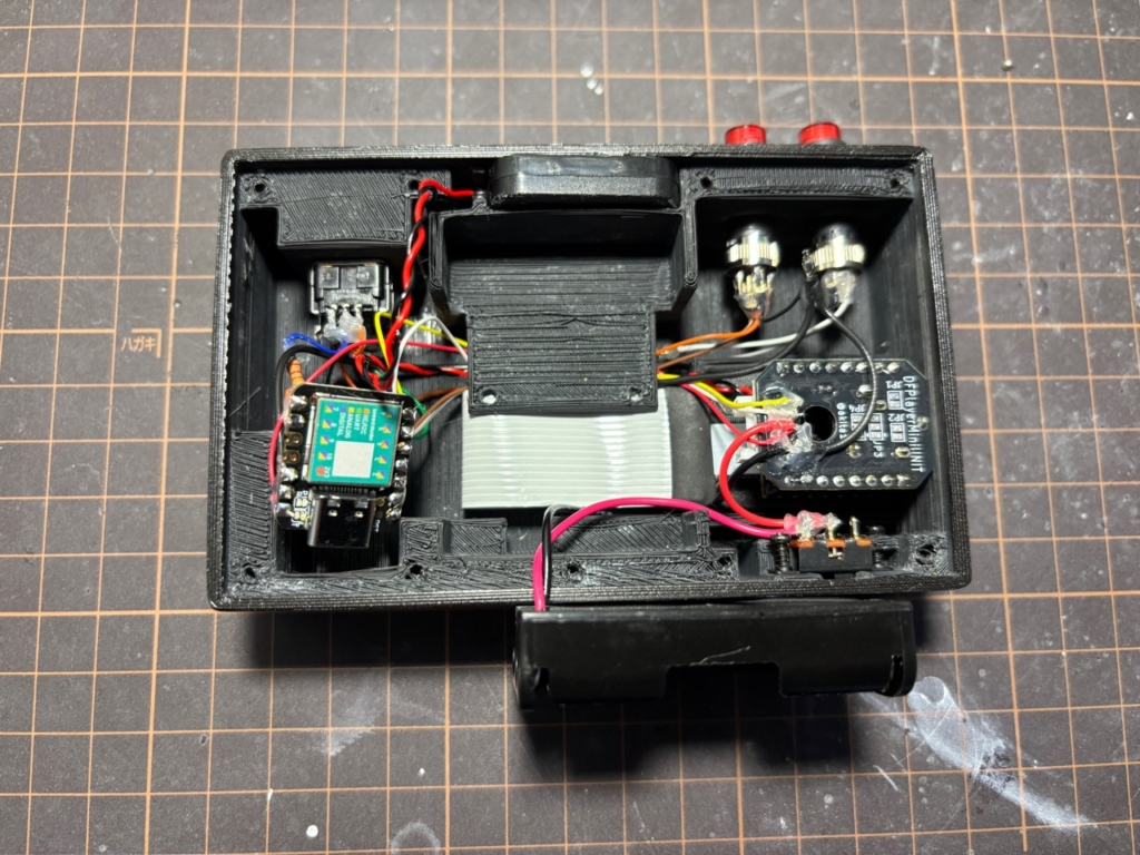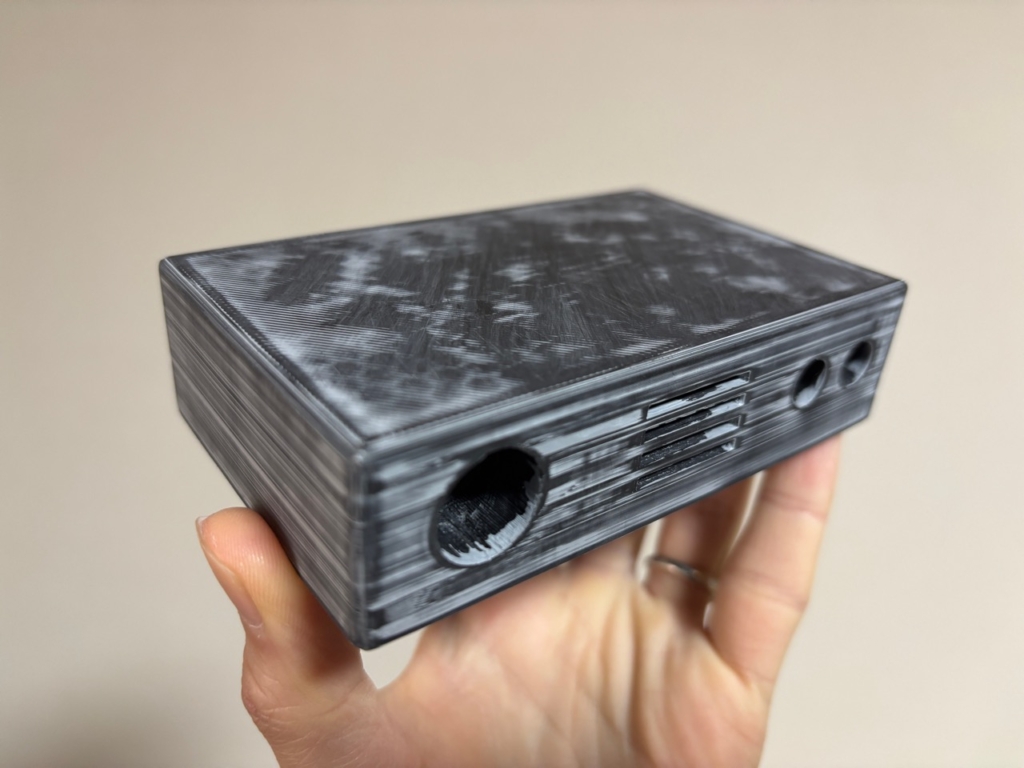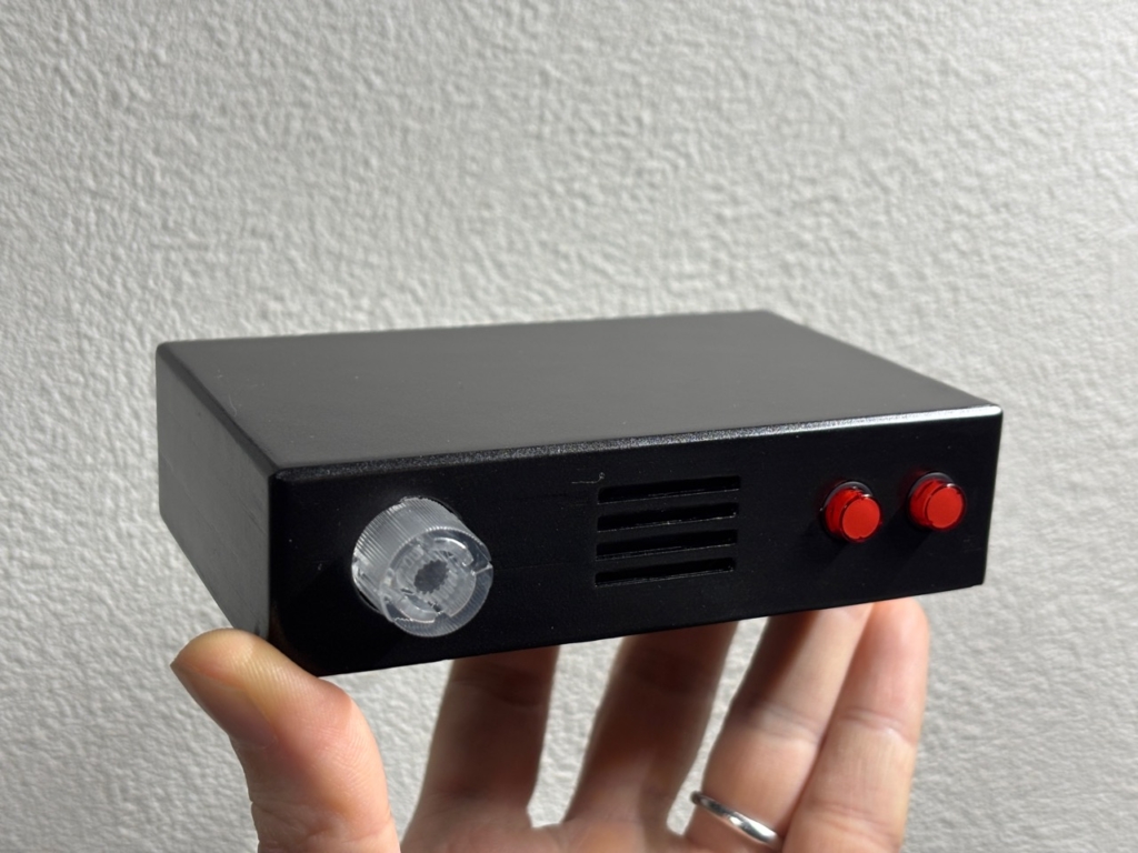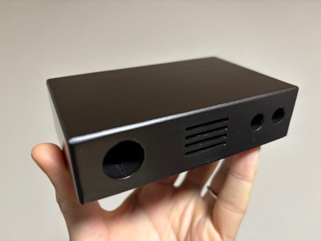 正面左がボリューム兼再生/停止ボタン、右側左がPREVボタン、右側右がNEXTボタン。見え辛いですが、真ん中にモノラルスピーカー。筐体は3Dプリンタ製です。