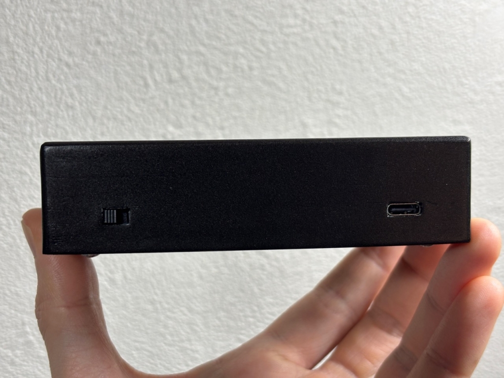 背面には電源スイッチと、給電兼プログラム書き替え用のUSB Type-C接続口。電源スイッチを右にすると電池駆動、左のままでUSBを挿すと、USB給電駆動になります。