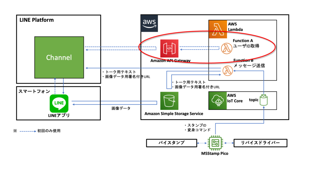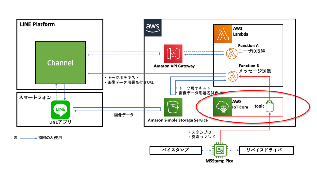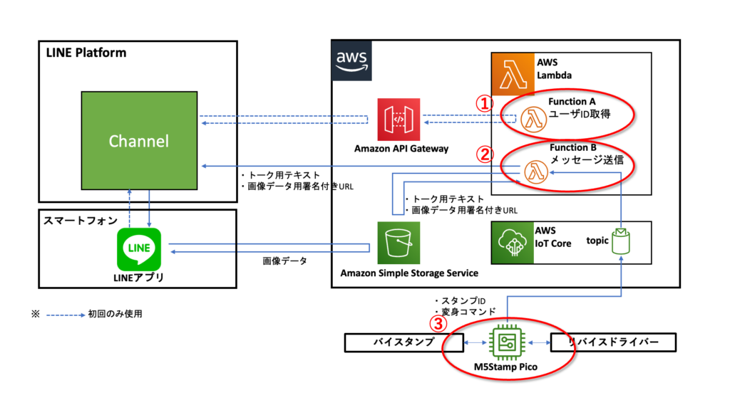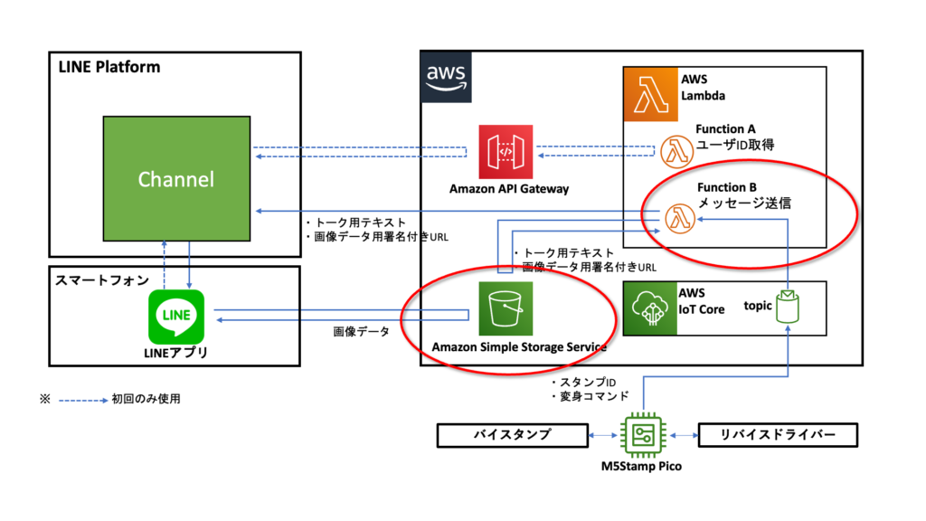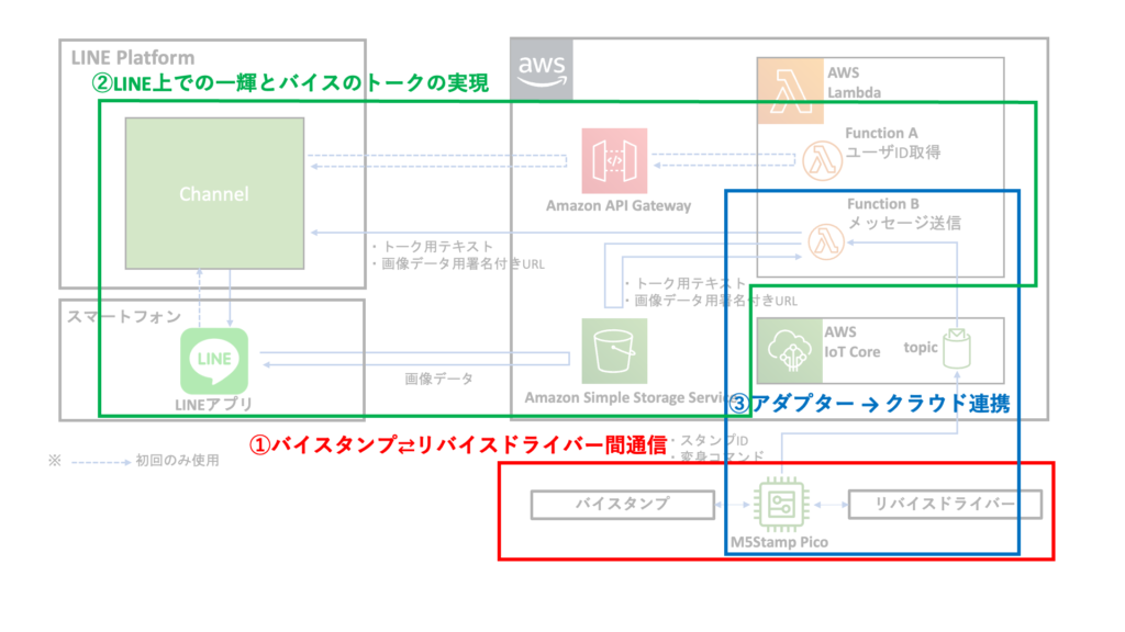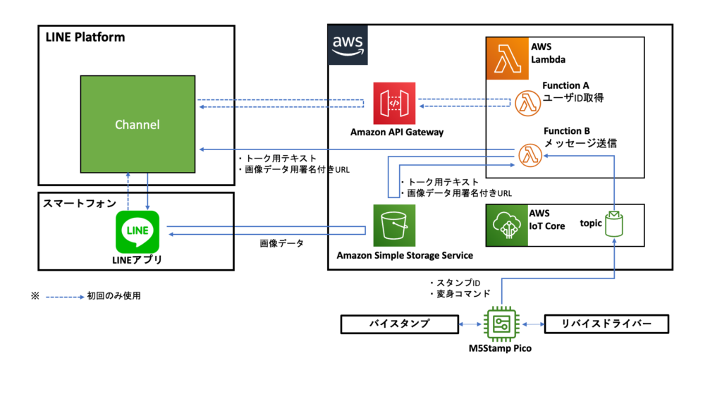 メッセージ内容として送るためのテキストや画像データはS3上に保管し、Lambdaでアダプターから受信したバイスタンプのIDや変身コマンドの情報に基づいて送信するテキストや画像データを選択、LINEのChannelへ送信しています。