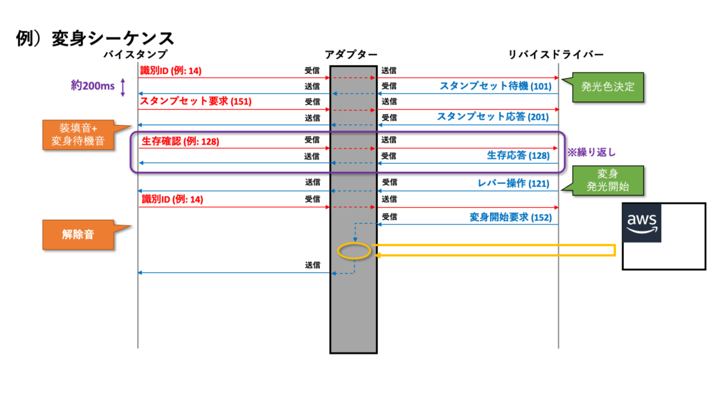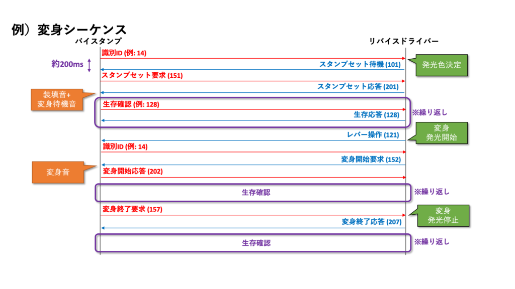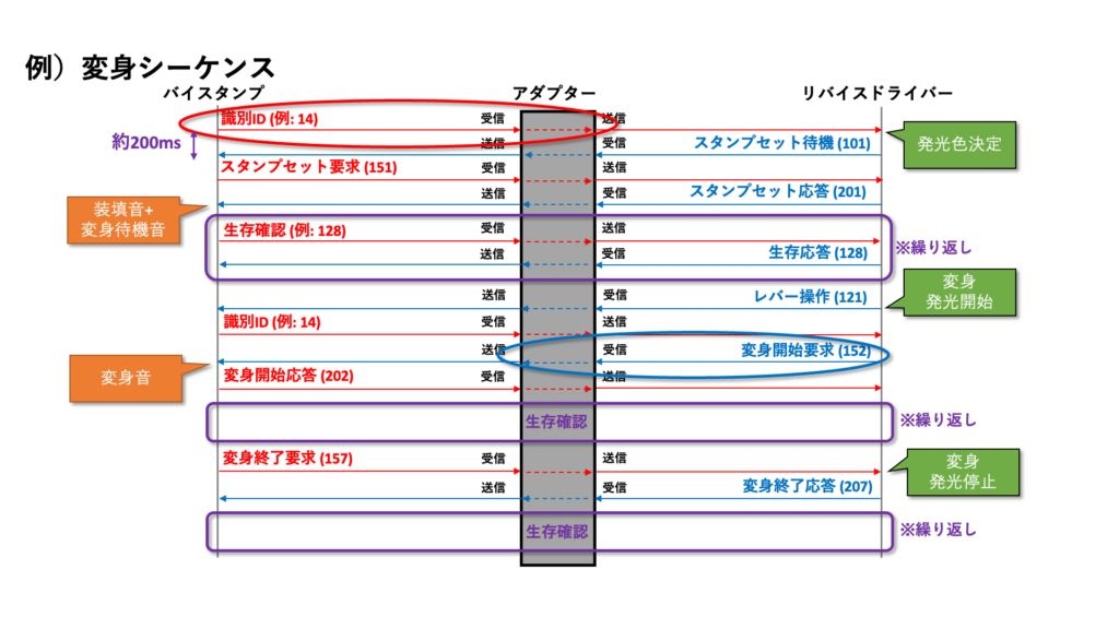 この形式でバイスタンプとリバイスドライバーが互いに整数値を送り合うことで、変身や必殺技、リミックスの音声、発光が発動するようになっています。バイスタンプとリバイスドライバーは、一度通信が始まると、およそ200ms程度の時間間隔で互いに整数値を送り続けており、この双方向通信が途絶えると、バイスタンプはリバイスドライバーから外されたと認識して、解除音が鳴るようになっています。