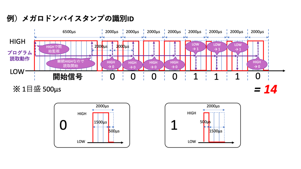 「6000μsのHIGH、500μsのLOW」が信号開始の合図で、その後の2000μsごとのHIGH・LOWの時間割合で0・1が決まります。8個分の0・1で、1 byte、0〜255の整数が表現されています。